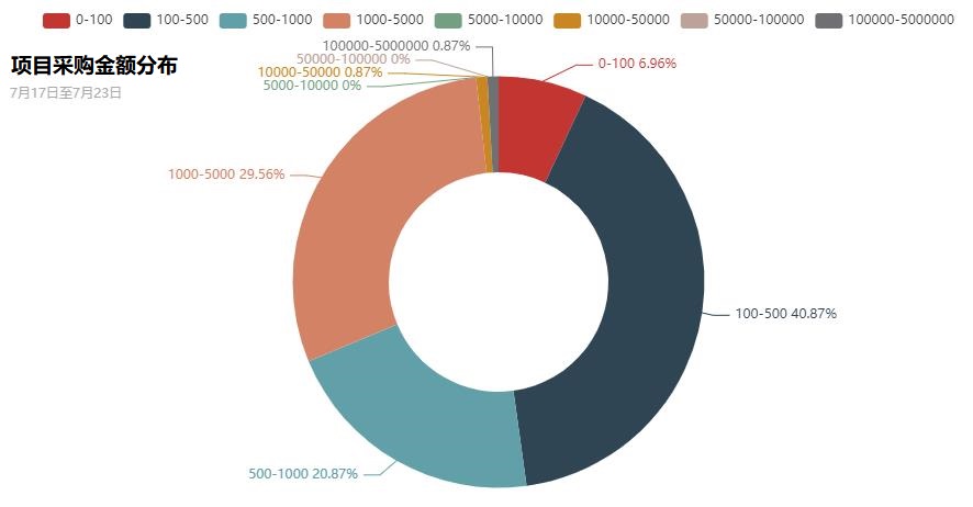 在本周的政府采购项目中,设计类前期项目17个,招标金额为0.32亿元,占比为2.99%;规划类前期项目为14个,招标金额为0.38亿元,占比为2.46%;监理类项目10个,招标金额为0.42亿元,占比为1.76%;施工类项目为8个,招标金额2.3亿元,占比为1.41%;设备采购类项目58个,招标金额1.36亿元,占比为10.21%;农村类项目42个,招标金额为2.62亿元,占比为7.39%,农业类项目23个,金额0.93亿元,占比4.05%。
