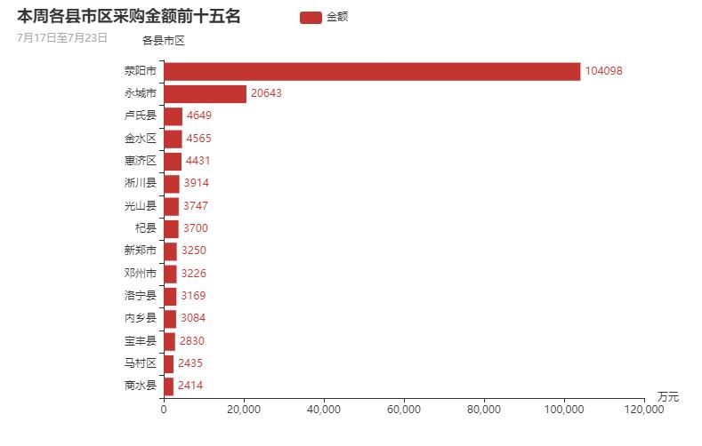 全省各县市区层面政府采购的总金额为23.5亿元。县市区排名前十五的依次为商水县、马村区、宝丰县、内乡县、洛宁县、邓州市、新郑市、杞县、光山县、淅川县、惠济区、金水区、卢氏县、永城市、荥阳市。排名前十五的各县市区本周采购项目总额达到17亿元,占全省各县市区采购金额的72.23%。