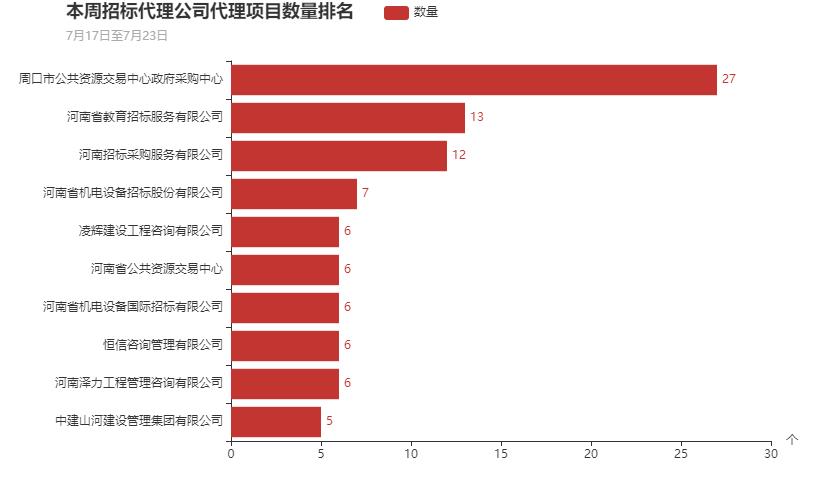 本周参与政府采购的招标代理机构为314家,本周代理项目数量最多的十家代理机构分别为中建山河建设管理集团有限公司、河南泽力工程管理咨询有限公司、恒信咨询管理有限公司、河南省机电设备国际招标有限公司、河南省公共资源交易中心、凌辉建设工程咨询有限公司、河南省机电设备招标股份有限公司、河南招标采购服务有限公司、河南省教育招标服务有限公司、周口市公共资源交易中心政府采购中心。其周口市公共资源交易中心政府采购中心本周代理27个项目处于首位。
