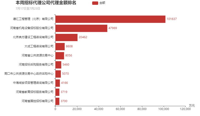 本周参与政府采购的招标代理机构为314家,本周代理项目金额最大的十家代理机构分别为河南省国控招标有限公司、河南省教育招标服务有限公司、中海域安项目管理咨询有限公司、周口市公共资源交易中心政府采购中心、河南招标采购服务有限公司、河南省公共资源交易中心、大成工程咨询有限公司、北京典方建设工程咨询有限公司、河南省机电设备招标股份有限公司、德汇工程管理(北京)有限公司。其中中德汇工程管理(北京)有限公司本周代理金额为10.1亿元处于首位。