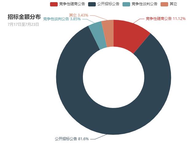 本周政府采购项目中,以公开招标形式采购项目总金额为27.8亿元,占比81.6%;以竞争性谈判形式采购项目总金额为1.31亿元,占比3.85%;以竞争性磋商形式采购项目总金额为3.79亿元,占比11.12%;以其它形式招标(含询价、资格预审)采购项目总金额为1.17亿元,占比为3.43%。根据招标金额统计,采用公开招标形式的项目平均采购金额为1628万元,采用竞争性谈判和竞争性磋商形式的项目平均采购金额为109万元和169万元,采用其他招标形式的项目平均采购金额为221万元。