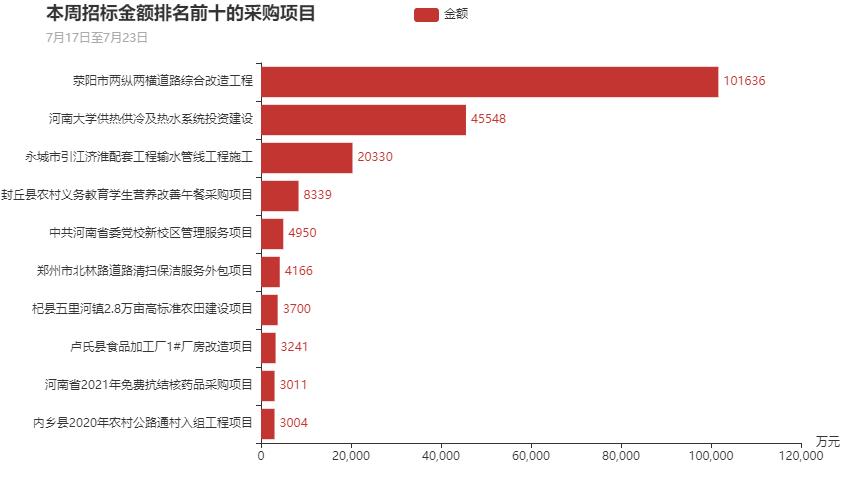 在本周政府采购的568个项目中,招标金额最大的十大项目依次为内乡县2020年农村公路通村入组工程项目、河南省2021年免费抗结核药品采购项目、卢氏县食品加工厂1#厂房改造项目、杞县五里河镇2.8万亩高标准农田建设项目、郑州市北林路道路清扫保洁服务外包项目、中共河南省委党校新校区管理服务项目、封丘县农村义务教育学生营养改善午餐采购项目、永城市引江济淮配套工程输水管线工程施工、河南大学供热供冷及热水系统投资建设、荥阳市两纵两横道路综合改造工程。该十大项目招标总金额为19.7亿元,占本周项目招标总金额的58%,其中排名第一的是荥阳市两纵两横道路综合改造工程,招标金额为10.1亿元,占本周项目招标总金额的29.78%。