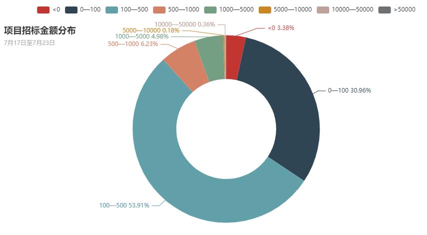 在招标的568个项目中,招标金额披露的项目有562个。其中招标金额在小于0万元之间的项目有19个,招标金额在0-100万元之间的项目有174个,招标金额在100-500万元之间的项目有303个,招标金额在500-1000万元之间的项目有35个,招标金额在1000-5000万元之间的项目有28个,招标金额在5000-10000万元之间的项目有1个,招标金额在大于10000万元之间的项目有2个。统计数据显示,500万元以下的政府采购项目有496个,占同期采购项目总量的88.25%。