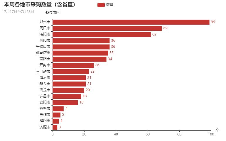 在本周的政府采购项目中,18个地市及省直排名中,其中郑州市、周口市、洛阳市、信阳市、平顶山市发布政府采购项目数量排在前五,五地市政府采购项目数量达到302个,占全省总量的56.45%。