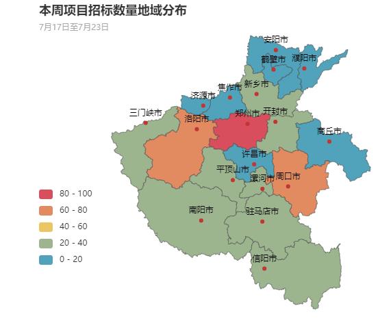 从采购项目总量分布上来看,本周郑州市、周口市、洛阳市、信阳市、平顶山市政府采购市场需求占主导地位。