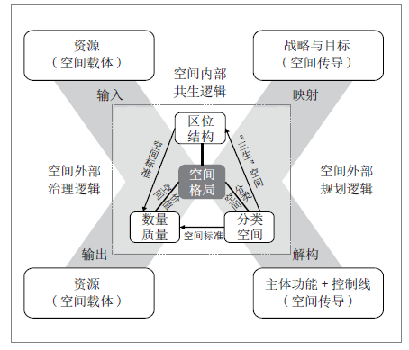 从研究视角上看,对空间内生秩序和空间开放系统的解读解决了空间内部和外部性融贯连通的问题。从概念内涵上看,空间格局的表象是空间结构,空间格局的本质是空间载体、空间传导和空间价值,空间载体是附着在空间上的资源,空间传导是各项空间治理手段,空间价值是空间数量和空间质量,三者构成了完整的空间格局内涵。