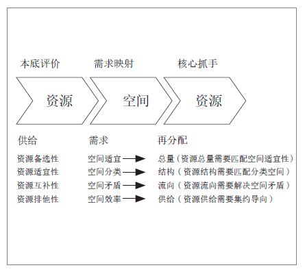从空间格局落地实施角度看,需要确定空间资源再分配的导向和方案,包括空间资源总量、结构、流向和供给。其核心作用包括两大方面:一是作为国土空间规划最核心的空间性管控内容,直接服务于规划意图的实现;二是通过差异化的空间资源配置促进用地结构、空间匹配,以及土地资源利用方式的优化。其中,空间资源总量需要匹配空间需求,空间资源结构需要匹配分类空间,空间资源流向需要解决空间矛盾,空间资源供给需要集约导向。