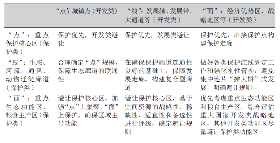 为了在大区域尺度下清晰直观和相对具象地描述各类空间的组织结构,应结合不同空间发展阶段和空间结构关系,在抽象结构表达上采用“高等级重点功能空间+ 主要走廊网络化链接+ 不同主体功能分区”的“点线面”组合方式。这是在运用区域规划中常用的“点—轴2.0系统”技术手段的基础上进行优化,注重解决各类空间矛盾冲突和明确冲突避让规则,构建“点线面”三类空间要素的矛盾冲突矩阵表,进一步梳理各类要素的融合叠加和避让规则(表2),协调各类空间的矛盾冲突。