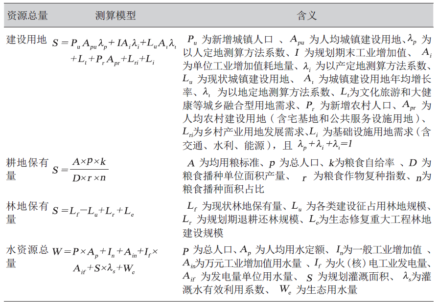 以土地资源和水资源为核心建立测算模型。其中,土地资源核心指标选取省级约束性指标—建设用地总量、耕地保有量和林地保有量。建设用地总量反映城镇、乡村等的空间需求,通过以人定地、以产定地、以水定地、以地定地等方法,解构建设空间的国家和省级战略、基础民生和文旅发展等空间需求。耕地保有量反映了农业空间需求,结合粮食自给率、经粮比和粮食作物复种系数等指标构建预测模型。林地保有量反映了生态空间需求,因此可综合考虑征占用林地规模、新一轮退耕还林方案和生态修复重大工程等指标构建预测模型。水资源核心指标选取省级约束性指标—水资源总量作为区域发展、相关规划制定和项目建设布局的刚性约束,并结合人均用水定额、行业单位用水量等指标构建预测模型(表3)。