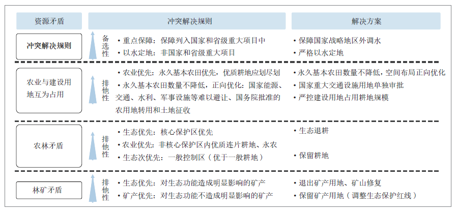 调整空间资源流向是落实空间格局调整,解决资源矛盾的直接途径。各类资源矛盾冲突本质上是对空间资源的争夺,需要基于上述价值导向和冲突解决规则进行梳理,通过对资源流向的调整,解决资源和空间矛盾,进而落实空间格局调整和优化的要求(图7)。