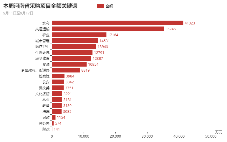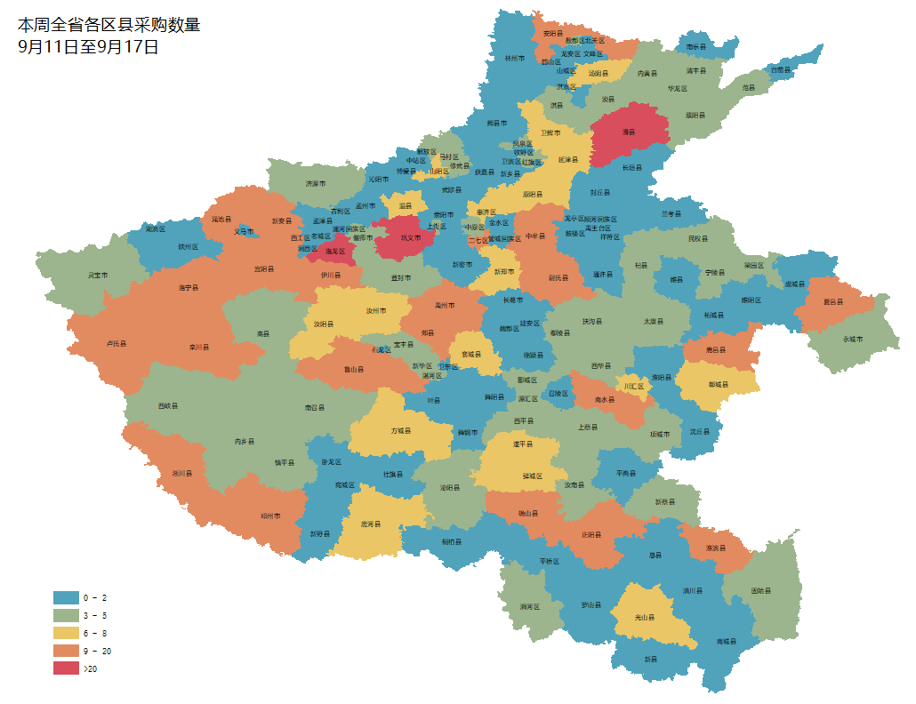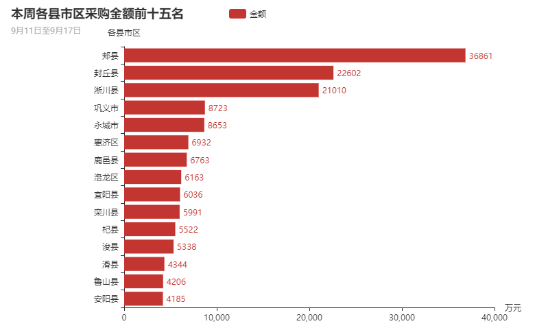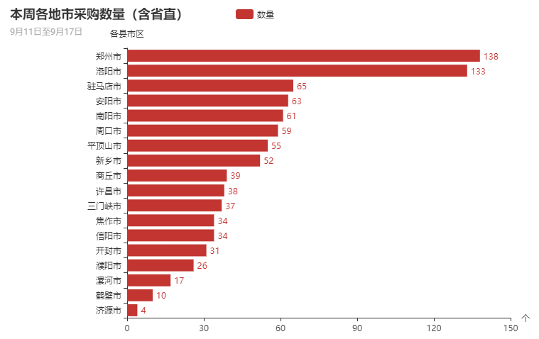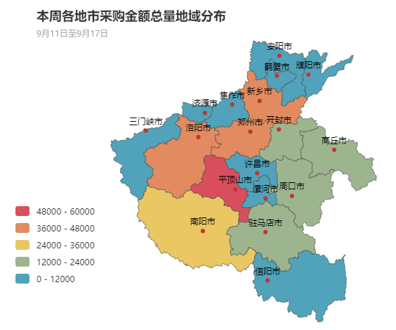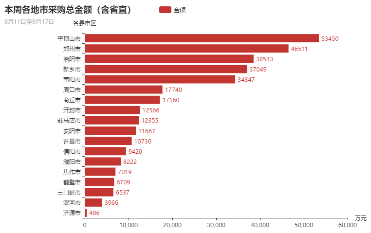 从采购金额总量分布上来看,本周平顶山市、郑州市、洛阳市、新乡市、南阳市政府采购市场需求占主导地位。