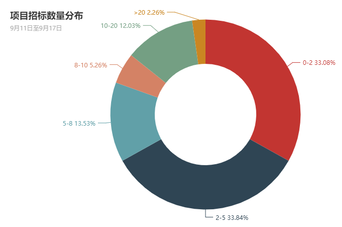 全省各县市区本周采购的项目为736个,其中有44个县市区采购项目小于2个,占全部采购县市区的33.08%;有45个县市区采购项目在2至5个,占全部采购县市区的33.84%;有18个县市区采购项目在5至8个,占全部采购县市区的13.53%;有7个县市区采购项目在8至10个,占全部采购县市区的5.26%;有16个县市区采购项目在10至20个,占全部采购县市区的12.03%;有3个县市区采购项目大于20个,占全部采购县市区的2.26%。