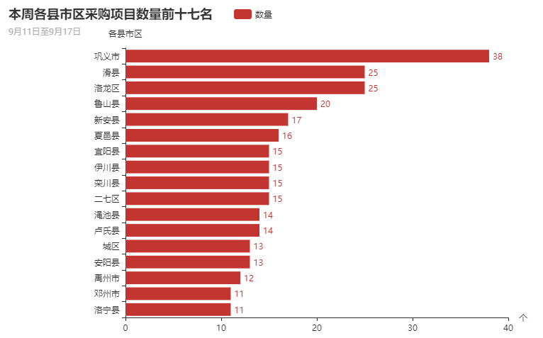 全省各县市区本周采购的项目为736个,占本周采购项目总量的82.14%。县市区排名前十七的依次为巩义市、洛龙区、滑县、鲁山县、新安县、夏邑县、二七区、栾川县、伊川县、宜阳县、卢氏县、渑池县、安阳县、城区、禹州市、洛宁县、邓州市。排名前十七的各县市区本周采购项目数量总量为289个,占全省各县市区采购总数量的39.27%。