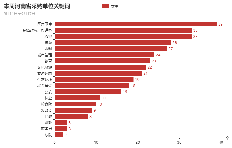 根据本周政府采购关键词检索,本周采购主体排名前十的主要是医疗卫生、乡镇政府、街道办、农业、资源、水利、城市管理、教育、文化旅游、交通运输、生态环境等部门。以上部门采购项目总数量为269个,占本周政府采购项目总量比例77.08%。