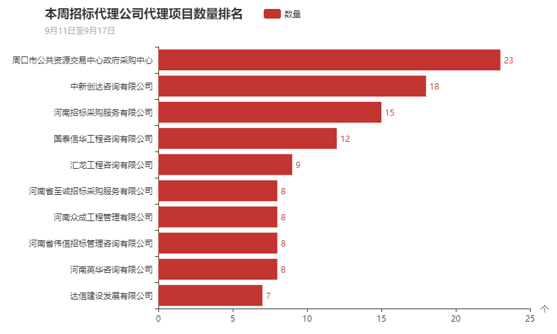 本周参与政府采购的招标代理机构为435家,本周代理项目数量最多的十家代理机构分别为周口市公共资源交易中心政府采购中心、中新创达咨询有限公司、河南招标采购服务有限公司、国泰信华工程咨询有限公司、汇龙工程咨询有限公司、河南英华咨询有限公司、河南省伟信招标管理咨询有限公司、河南众成工程管理有限公司、河南省至诚招标采购服务有限公司、达信建设发展有限公司。其中周口市公共资源交易中心政府采购中心本周代理23个项目处于首位。