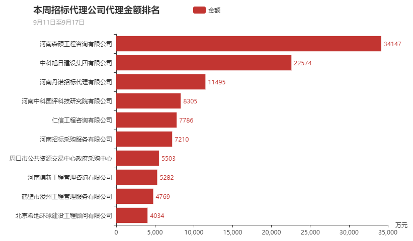 本周参与政府采购的招标代理机构为435家,本周代理项目金额最大的十家代理机构分别为河南森硕工程咨询有限公司、中科旭日建设集团有限公司、河南丹诺招标代理有限公司、河南中科国评科技研究院有限公司、仁信工程咨询有限公司、河南招标采购服务有限公司、周口市公共资源交易中心政府采购中心、河南德新工程管理咨询有限公司、鹤壁市浚州工程管理服务有限公司、北京希地环球建设工程顾问有限公司。其中河南森硕工程咨询有限公司本周代理金额为3.41亿元处于首位。
