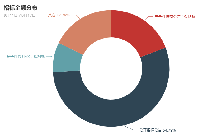 本周政府采购项目中,以公开招标形式采购项目总金额为18.93亿元,占比54.79%;以竞争性谈判形式采购项目总金额为2.84亿元,占比8.24%;以竞争性磋商形式采购项目总金额为6.62亿元,占比19.18%;以其它形式招标(含询价、资格预审)采购项目总金额为6.14亿元,占比为17.79%。根据招标金额统计,采用公开招标形式的项目平均采购金额为941万元,采用竞争性谈判和竞争性磋商形式的项目平均采购金额为138万元和156万元,采用其他招标形式的项目平均采购金额为614万元。