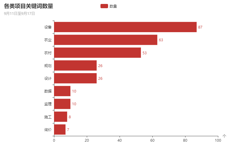 在本周的政府采购项目中,设备、农业类项目占比最大,其次为农村类、规划类、设计类、数据类、监理类、施工类、询价类。数据表明,设备、农业类项目已经成为政府采购的主要方向。
