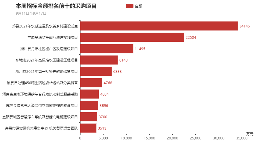 在本周政府采购的930个项目中,招标金额最大的十大项目依次为郏县2021年水系连通及水美乡村建设试点、兰原高速封丘南互通连接线项目、淅川县丹阳社区棚户区改造建设项目、永城市2021年高标准农田建设工程项目、淅川县2021年第一批补充耕地储备项目、浚县日处理450吨生活垃圾转运站及分类科普、河南省生态环境保护综合行政执法制式服装采购、鹿邑县修紫气大道沿街立面微更整理改造项目、宜阳县城区智慧停车系统及智能充电桩建设项目、许昌市建安区机关事务中心 机关餐厅运营团队。该十大项目招标总金额为10.3亿元,占本周项目招标总金额的29.82%,其中排名第一的是郏县2021年水系连通及水美乡村建设试点县建设项目,招标金额为3.41亿元,占本周项目招标总金额的9.88%。