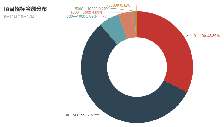 在招标的930个项目中,招标金额披露的项目有930个。其中招标金额在0-100万元之间的项目有295个,招标金额在100-500万元之间的项目有530个,招标金额在500-1000万元之间的项目有55个,招标金额在1000-5000万元之间的项目有45个,招标金额在5000-10000万元之间的项目有2个,招标金额在大于50000万元之间的项目有3个。统计数据显示,500万元以下的政府采购项目有825个,占同期采购项目总量的88.66%。
