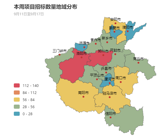 从采购项目总量分布上来看,本周郑州市、洛阳市、驻马店市、安阳市、南阳市政府采购市场需求占主导地位。