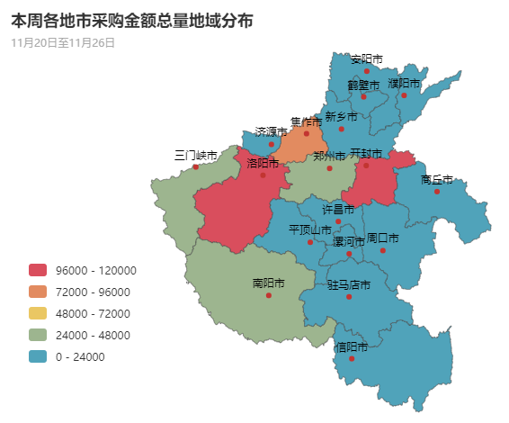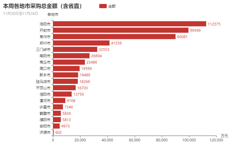 从采购金额总量分布上来看,本周洛阳市、开封市、焦作市、郑州市、三门峡市政府采购市场需求占主导地位。