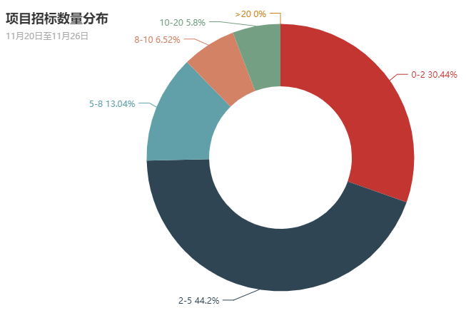 全省各县市区本周采购的项目为621个,其中有42个县市区采购项目小于2个,占全部采购县市区的30.44%;有61个县市区采购项目在2至5个,占全部采购县市区的44.2%;有18个县市区采购项目在5至8个,占全部采购县市区的13.04%;有9个县市区采购项目在8至10个,占全部采购县市区的6.52%;有8个县市区采购项目在10至20个,占全部采购县市区的5.8%;有0个县市区采购项目大于20个,占全部采购县市区的0%。