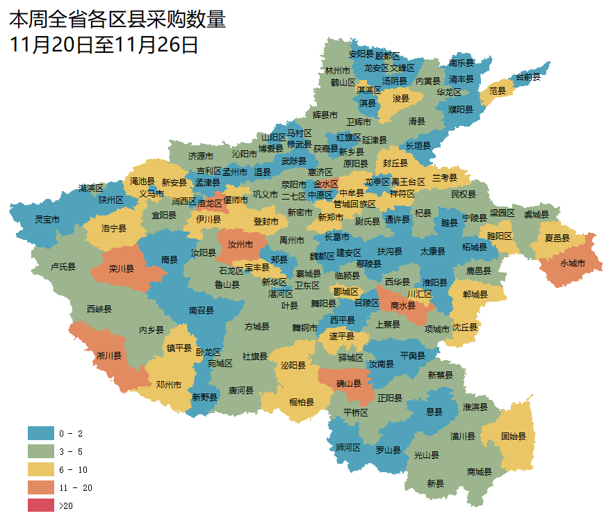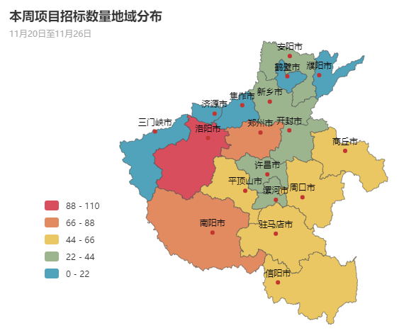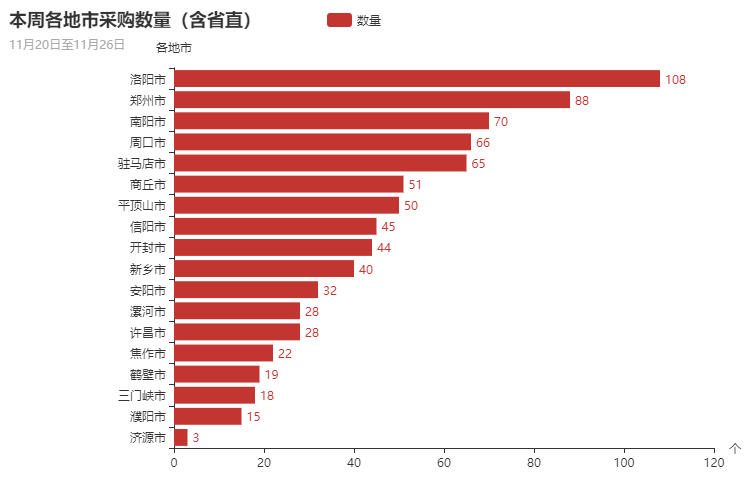 从采购项目总量分布上来看,本周洛阳市、郑州市、南阳市、周口市、驻马店市政府采购市场需求占主导地位。