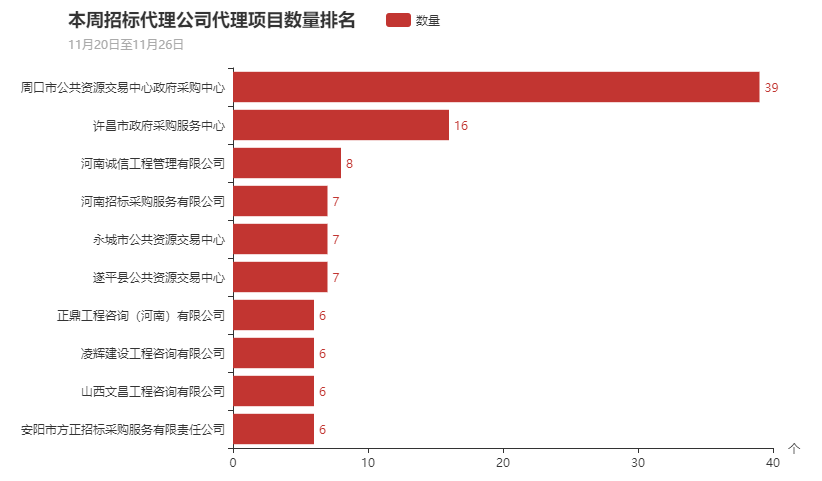 本周参与政府采购的招标代理机构为418家,本周代理项目数量最多的十家代理机构分别为周口市公共资源交易中心政府采购中心、许昌市政府采购服务中心、河南诚信工程管理有限公司、河南招标采购服务有限公司、永城市公共资源交易中心、遂平县公共资源交易中心、正鼎工程咨询(河南)有限公司、凌辉建设工程咨询有限公司、山西文昌工程咨询有限公司、安阳市方正招标采购服务有限责任公司。其中周口市公共资源交易中心政府采购中心本周代理39个项目处于首位。