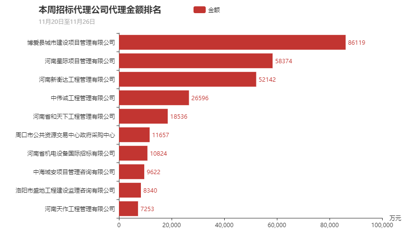 本周参与政府采购的招标代理机构为418家,本周代理项目金额最大的十家代理机构分别为博爱县城市建设项目管理有限公司、河南星际项目管理有限公司、河南新衡达工程管理有限公司、中伟诚工程管理有限公司、河南省和天下工程管理有限公司、周口市公共资源交易中心政府采购中心、河南省机电设备国际招标有限公司、中海域安项目管理咨询有限公司、洛阳市盛地工程建设监理咨询有限公司、河南天作工程管理有限公司。其中博爱县城市建设项目管理有限公司本周代理金额为8.61亿元处于首位。