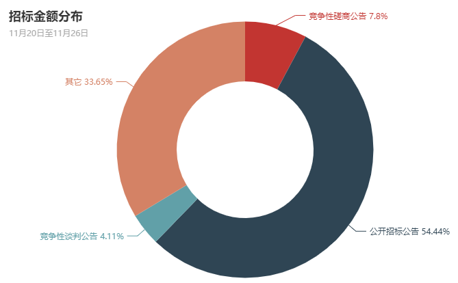 本周数据表明,河南政府采购市场中,公开招标、竞争性谈判和竞争性磋商形式在政府采购中依然占主体地位。