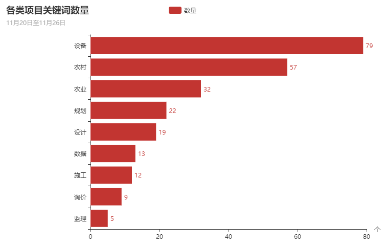 在本周的政府采购项目中,设备、农村类项目占比最大,其次为农业类、规划类、设计类、数据类、施工类、询价类、监理类。数据表明,设备、农村类项目已经成为政府采购的主要方向。