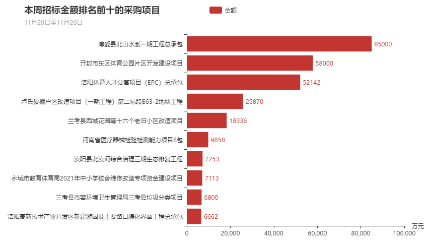 在本周政府采购的816个项目中,招标金额最大的十大项目依次为博爱县北山水系一期工程总承包、开封市东区体育公园片区开发建设项目、洛阳体育人才公寓项目(EPC)总承包、卢氏县棚户区改造项目(一期工程)第二标段E63-2地块工程、兰考县西城花园等十六个老旧小区改造项目、河南省医疗器械检验检测能力项目8包、汝阳县北汝河综合治理三期生态修复工程、永城市教育体育局2021年中小学校舍维修改造专项资金建设项目兰考县市容环境卫生管理局兰考县垃圾分类项目、洛阳高新技术产业开发区新建游园及主要路口绿化界面工程总承包。该十大项目招标总金额为27.7亿元,占本周项目招标总金额的50.03%,其中排名第一的是博爱县北山水系一期工程总承包,招标金额为8.5亿元,占本周项目招标总金额的15.35%。