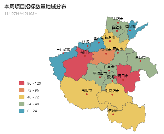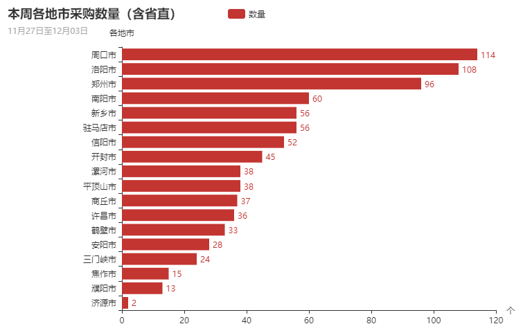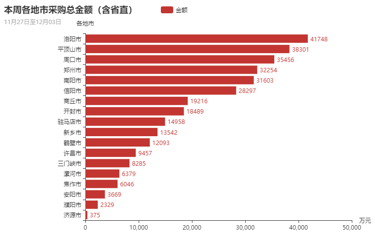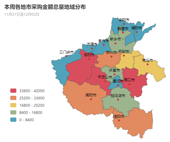 从采购金额总量分布上来看,本周洛阳市、平顶山市、周口市、郑州市、南阳市政府采购市场需求占主导地位。