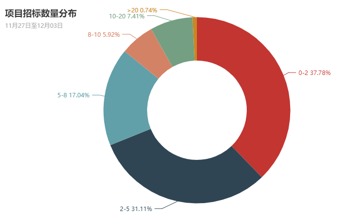 全省各县市区本周采购的项目为636个,其中有51个县市区采购项目小于2个,占全部采购县市区的37.78%;有42个县市区采购项目在2至5个,占全部采购县市区的31.11%;有23个县市区采购项目在5至8个,占全部采购县市区的17.04%;有8个县市区采购项目在8至10个,占全部采购县市区的5.92%;有10个县市区采购项目在10至20个,占全部采购县市区的7.41%;有1个县市区采购项目大于20个,占全部采购县市区的0.74%。