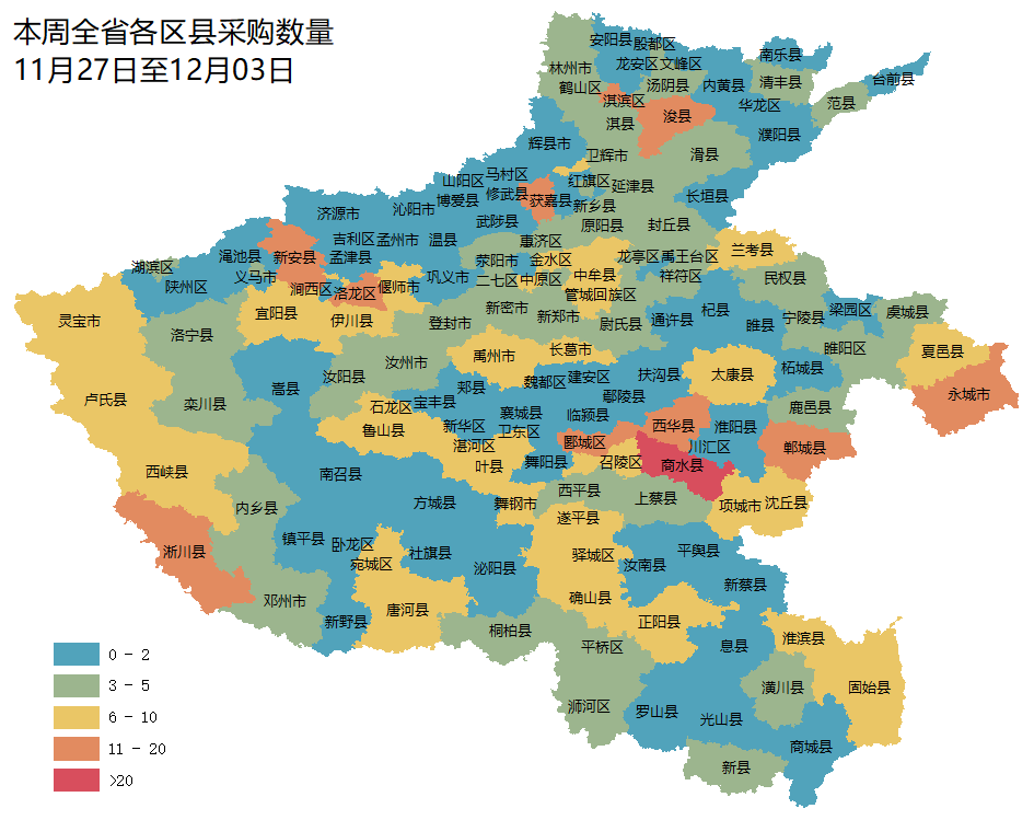 从采购项目总量分布上来看,本周周口市、洛阳市、郑州市、南阳市、新乡市政府采购市场需求占主导地位。