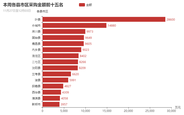 全省各县市区层面政府采购的总金额为26.07亿元。县市区排名前十五的依次为叶县、永城市、淅川县、固始县、鹿邑县、内乡县、洛龙区、二七区、汝阳县、兰考县、浚县、获嘉县、西华县、淮滨县、新郑市。排名前十五的各县市区本周采购项目总额达到13.63亿元,占全省各县市区采购金额的52.31%。