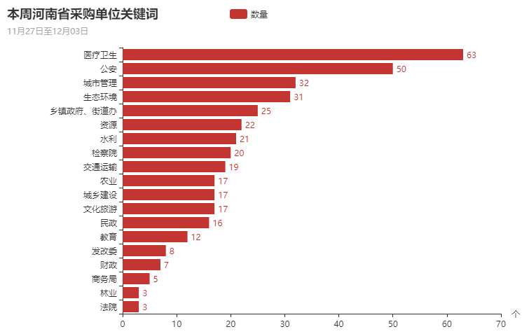 根据本周政府采购关键词检索,本周采购主体排名前十的主要是医疗卫生、公安、城市管理、生态环境、乡镇政府、街道办、资源、水利、检察院、交通运输、农业等部门。以上部门采购项目总数量为300个,占本周政府采购项目总量比例77.32%。