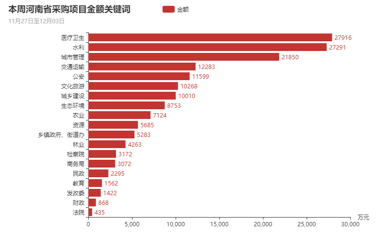 根据本周政府采购项目采购金额分析,本周采购主体排名前十的主要是医疗卫生、水利、城市管理、交通运输、公安、文化旅游、城乡建设、生态环境、农业、资源等部门。以上部门采购项目总金额为14.27亿元,占本周政府采购项目总额比例接近86.45%。
