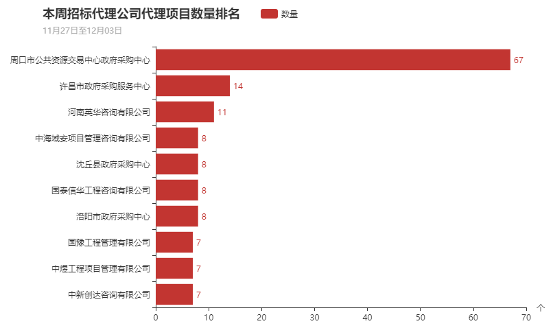 本周参与政府采购的招标代理机构为408家,本周代理项目数量最多的十家代理机构分别为周口市公共资源交易中心政府采购中心、许昌市政府采购服务中心、河南英华咨询有限公司、中海域安项目管理咨询有限公司、沈丘县政府采购中心、国泰信华工程咨询有限公司、洛阳市政府采购中心、国豫工程管理有限公司、中煜工程项目管理有限公司、中新创达咨询有限公司。其中周口市公共资源交易中心政府采购中心本周代理67个项目处于首位。