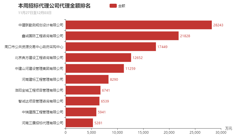 本周参与政府采购的招标代理机构为408家,本周代理项目金额最大的十家代理机构分别为中建联勘测规划设计有限公司、鑫诚国际工程咨询有限公司、周口市公共资源交易中心政府采购中心、北京典方建设工程咨询有限公司、中建山河建设管理集团有限公司、河南建标工程管理有限公司、洛阳全城工程项目管理有限公司、智诚达项目管理咨询有限公司、中瑞建园工程管理有限公司、河南三康招标代理有限公司。其中中建联勘测规划设计有限公司本周代理金额为2.82亿元处于首位。