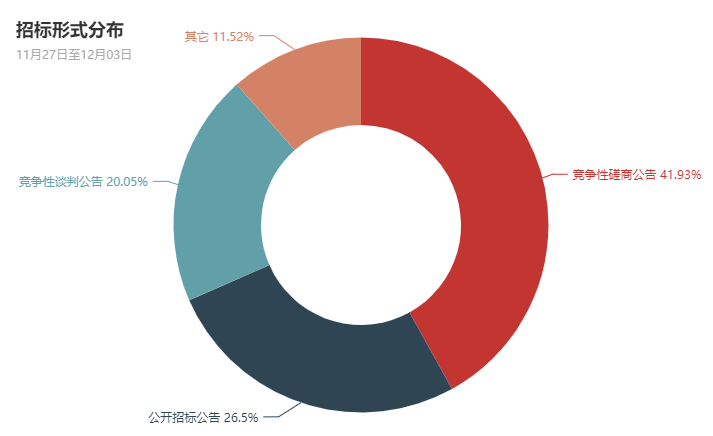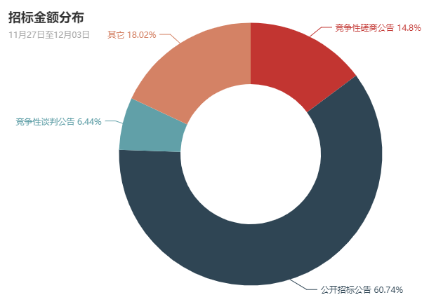 本周数据表明,河南政府采购市场中,公开招标、竞争性谈判和竞争性磋商形式在政府采购中依然占主体地位。