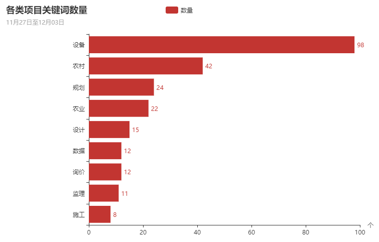 在本周的政府采购项目中,设备、农村类项目占比最大,其次为规划类、农业类、设计类、数据类、询价类、监理类、施工类。数据表明,设备、农村类项目已经成为政府采购的主要方向。
