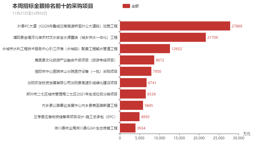 在本周政府采购的868个项目中,招标金额最大的十大项目依次为叶县PC大道(G329舟鲁线兰南高速桥至叶公大道段)加宽工程、濮阳县金堤河北岸农村饮水安全水源置换(城乡供水一体化)工程、永城市水利工程技术服务中心引江济淮(永城段)配套工程输水管道工程、鹿邑县文化旅游产业融合升级项目(旅游专线项目)、信阳市中心医院羊山分院医疗设备(一批)采购项目、汝阳农发投资发展有限公司汝阳县高速引线绿化建设项目、郑州市二七区城市管理局二七区2021年生活垃圾分类项目、内乡县公路事业发展中心内乡县商圣路新建工程、兰考县应急物资储备库项目设计-施工总承包(EPC)、淅川县林业局淅川县G241生态修复工程。该十大项目招标总金额为10.68亿元,占本周项目招标总金额的30.34%,其中排名第一的是叶县PC大道(G329舟鲁线兰南高速桥至叶公大道段)加宽工程,招标金额为2.78亿元,占本周项目招标总金额的7.91%。