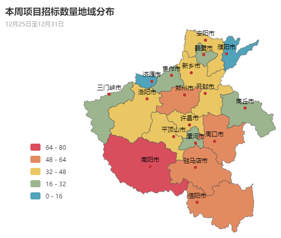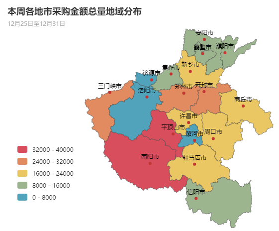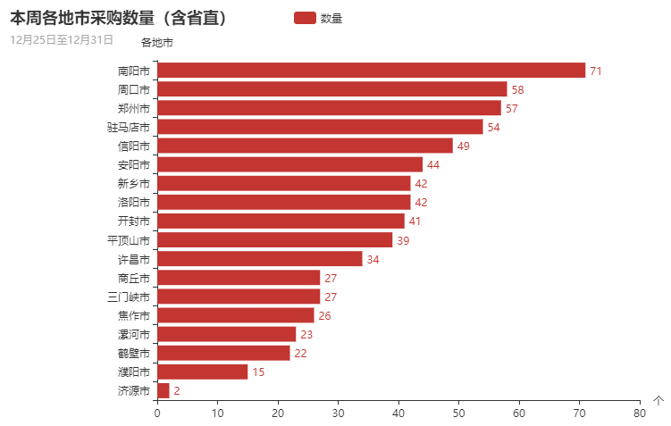 从采购项目总量分布上来看,本周南阳市、周口市、郑州市、驻马店市、信阳市政府采购市场需求占主导地位。