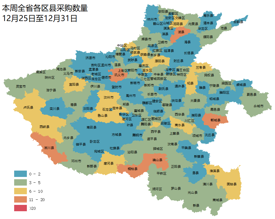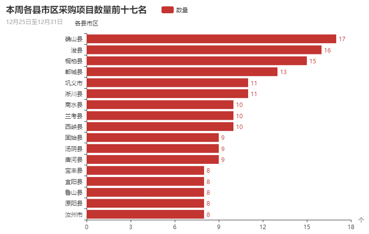 全省各县市区本周采购的项目为533个,占本周采购项目总量的79.2%。县市区排名前十七的依次为确山县、浚县、桐柏县、郸城县、巩义市、淅川县、商水县、兰考县、西峡县、固始县、汤阴县、唐河县、宝丰县、宜阳县、鲁山县、原阳县、汝州市。排名前十七的各县市区本周采购项目数量总量为180个,占全省各县市区采购总数量的33.77%。