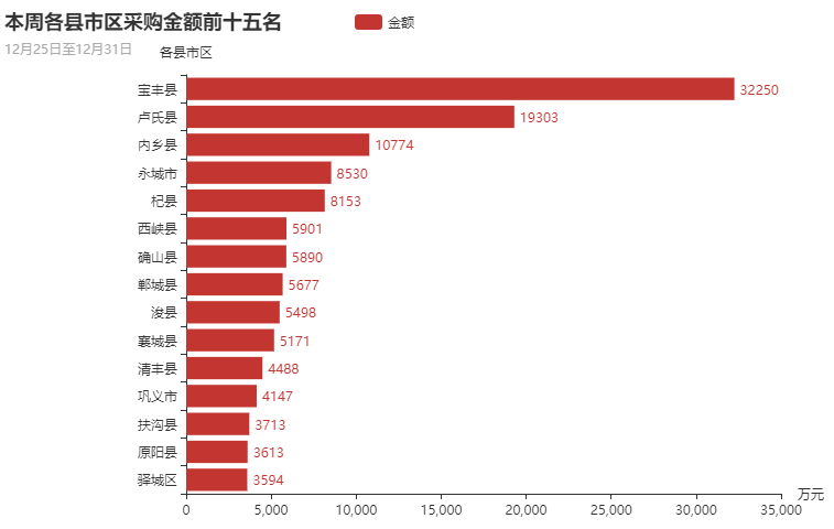 全省各县市区层面政府采购的总金额为22.48亿元。县市区排名前十五的依次为宝丰县、卢氏县、内乡县、永城市、杞县、西峡县、确山县、郸城县、浚县、襄城县、清丰县、巩义市、扶沟县、原阳县、驿城区。排名前十五的各县市区本周采购项目总额达到12.67亿元,占全省各县市区采购金额的56.34%。