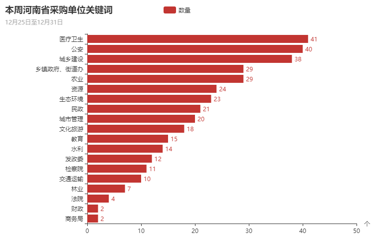 根据本周政府采购关键词检索,本周采购主体排名前十的主要是医疗卫生、公安、城乡建设、乡镇政府、街道办、农业、资源、生态环境、民政、城市管理、文化旅游等部门。以上部门采购项目总数量为283个,占总部门的78.61%。