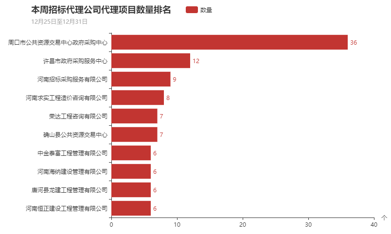 7、本周招标代理领域竞争较为激烈,但周口市公共资源交易中心政府采购中心、智远工程管理有限公司本周较为活跃并具有相对市场优势。