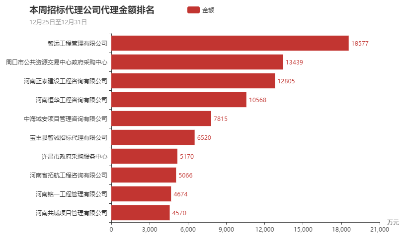 本周参与政府采购的招标代理机构为369家,本周代理项目金额最大的十家代理机构分别为智远工程管理有限公司、周口市公共资源交易中心政府采购中心、河南正泰建设工程咨询有限公司、河南恒华工程咨询有限公司、中海域安项目管理咨询有限公司、宝丰县智诚招标代理有限公司、许昌市政府采购服务中心、河南省拓航工程咨询有限公司、河南铭一工程管理有限公司、河南共城项目管理有限公司。其中智远工程管理有限公司本周代理金额为1.85亿元处于首位。
